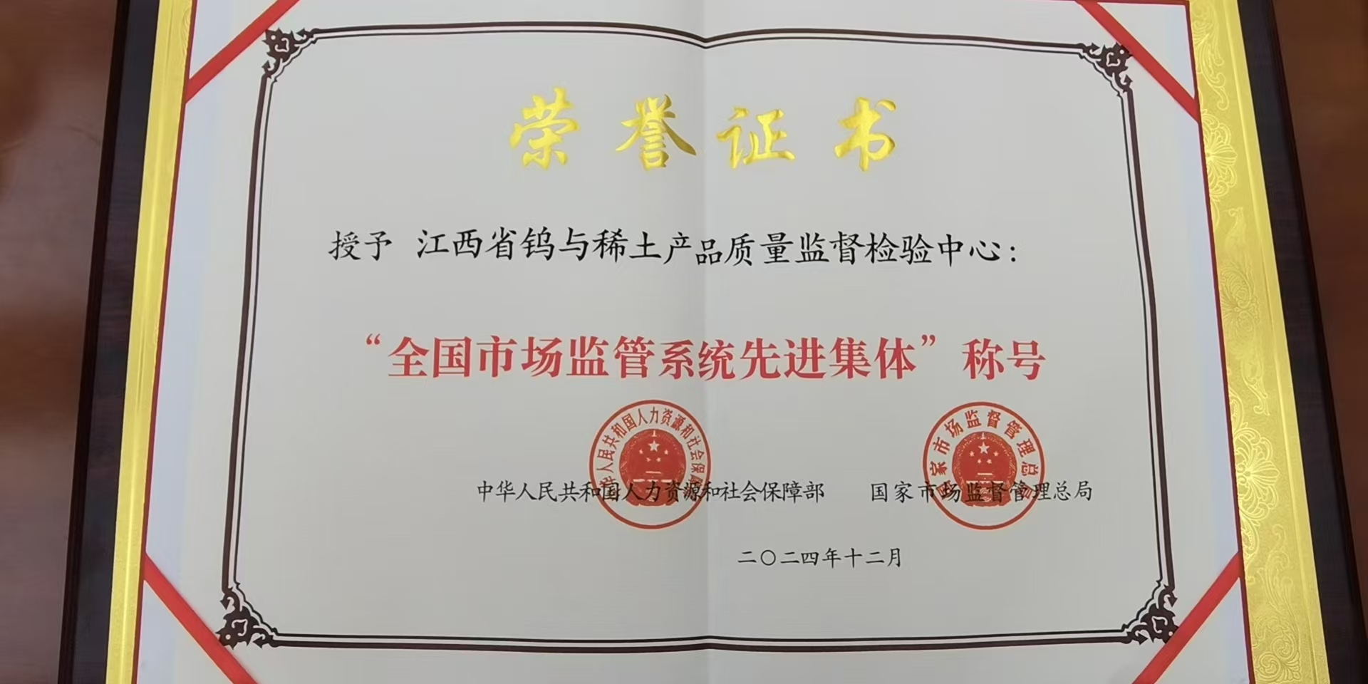 2024年12月22日,在北京召开的全国市场监管系统先进集体和先进工作者表彰大会上,江西省钨与稀土质检中心被人力资源和社会保障部、国家市场监督管理总局授予“全国市场监管系统先进集体”称号。江西省钨与稀土质检中心主任李平赴北京参加表彰大会。