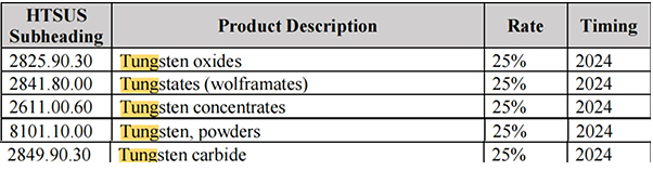 与此前文件相比的新变化是:美国贸易代表决定提议将以下三个钨产品的关税税率提高到25%。为此,USTR将发布一份单独的通知,要求有关各方就此提供意见,三类钨产品如下: