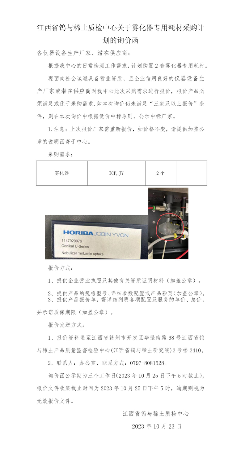 江西省钨与稀土质检中心关于雾化器专用耗材采购计划的询价函