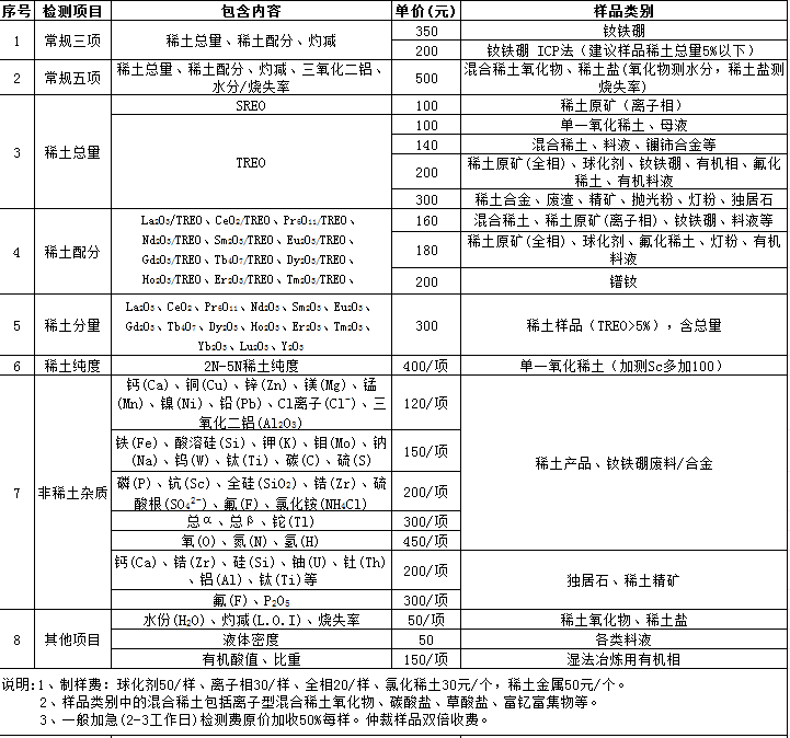 六、稀土产品分析检测价格表
