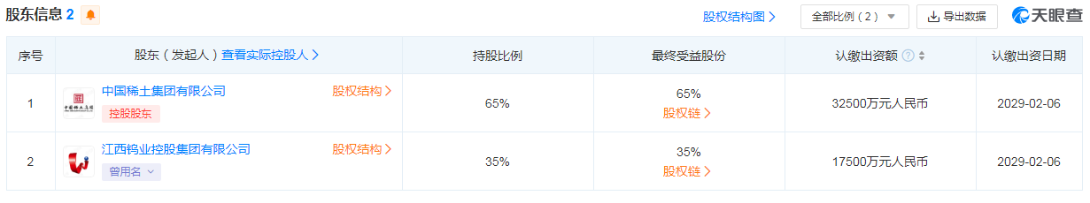 股东信息显示,该公司由中国稀土集团有限公司、江西钨业控股集团有限公司分别持股65%、35%。